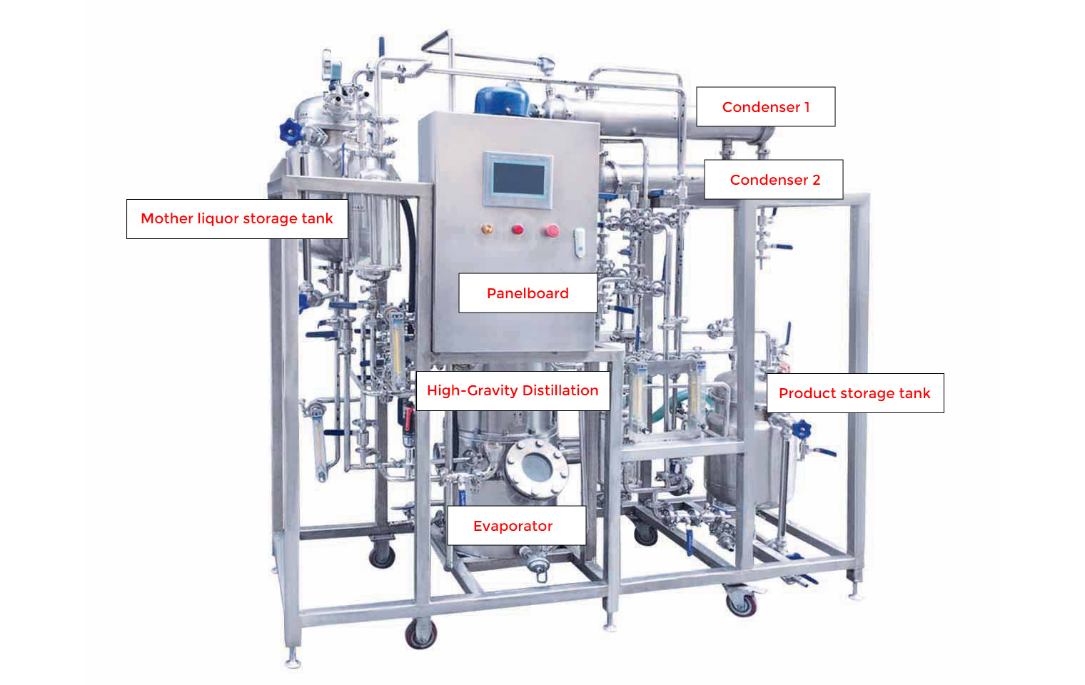 يتكون النموذج الأولي لتقطير الدوران من عدة أنظمة ، بما في ذلك المبخر الذي يتم تسخينه الكهربائي ، ووحدة التقطير ، وخزان المواد الخام ، والمكثف ، وخزان المنتج النهائي. تم تصميم هذا النظام لاستعادة وتنقية المذيبات العضوية مثل الإيثانول ، الميثانول ، الأسيتون ، أسيتات الإيثيل ، الأسيتونيتريل ، رباعي هيدروفوران ، ثنائي كلورو ميثان ، DMF ، DMSO ، التولوين ، الأيزوبروبانول ، وتيتانول. بمجرد البدء ، فإنه يستخرج بسرعة وتنقية المنتج النهائي.